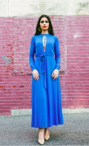 The Zahara Top is a mix of midnight blue and black knit lace, incorporated with a high neck lace slightly cropped top. It is long sleeved and embellished with a floral, embroidered design of black and midnight blue. We paired it with our Penny Pencil Skirt.