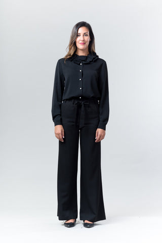 This long sleeve wide body blouse has a beautiful ruffle overlay. The overlay has white piping detail along the ruffle and pearl details up the sleeve and shoulder. Pair this with black pants or a pencil skirt. This top also comes in a red.
