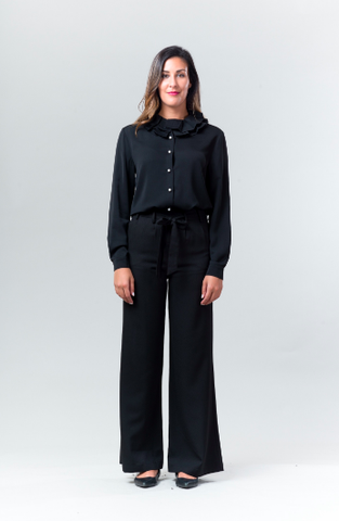 This crinkled, chiffon, navy blue tunic top is an easy to wear piece that looks great on every body type. It has cuffed long-sleeves and a high neck line with a button down and bow-tie detail! Can be worn as a dress or layered over tights or pants for a more modern look.