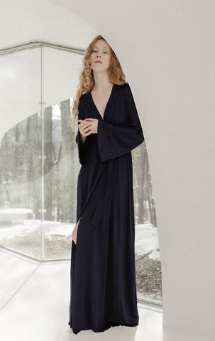 Long light cobalt blue box cut, maxi dress, with super cute cut-outs on the sleeves, slit in the back and the cinched waistline allows for a modest chic feel. Pair it with a black cropped undershirt for complete coverage.